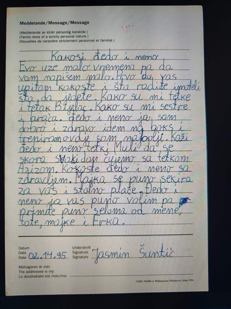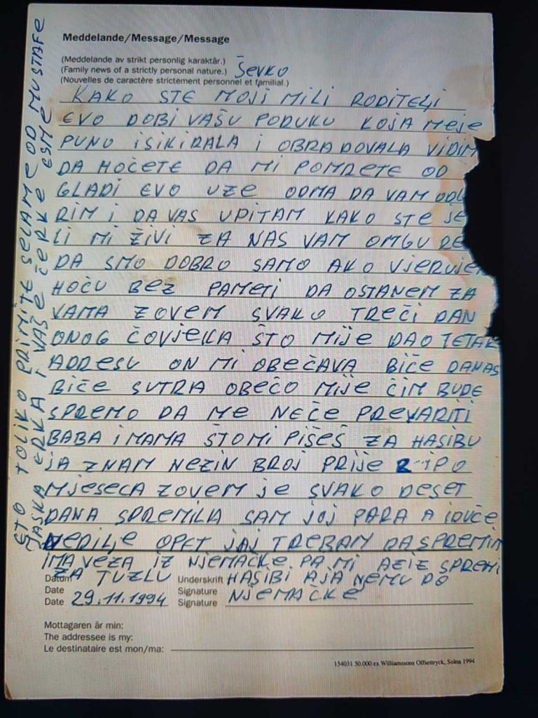 ▪︎ Pismo iz Švedske poslano porodici Hasanović u Srebrenici tokom opsade 29.11.1994. godine. (Slika 3 i 4)